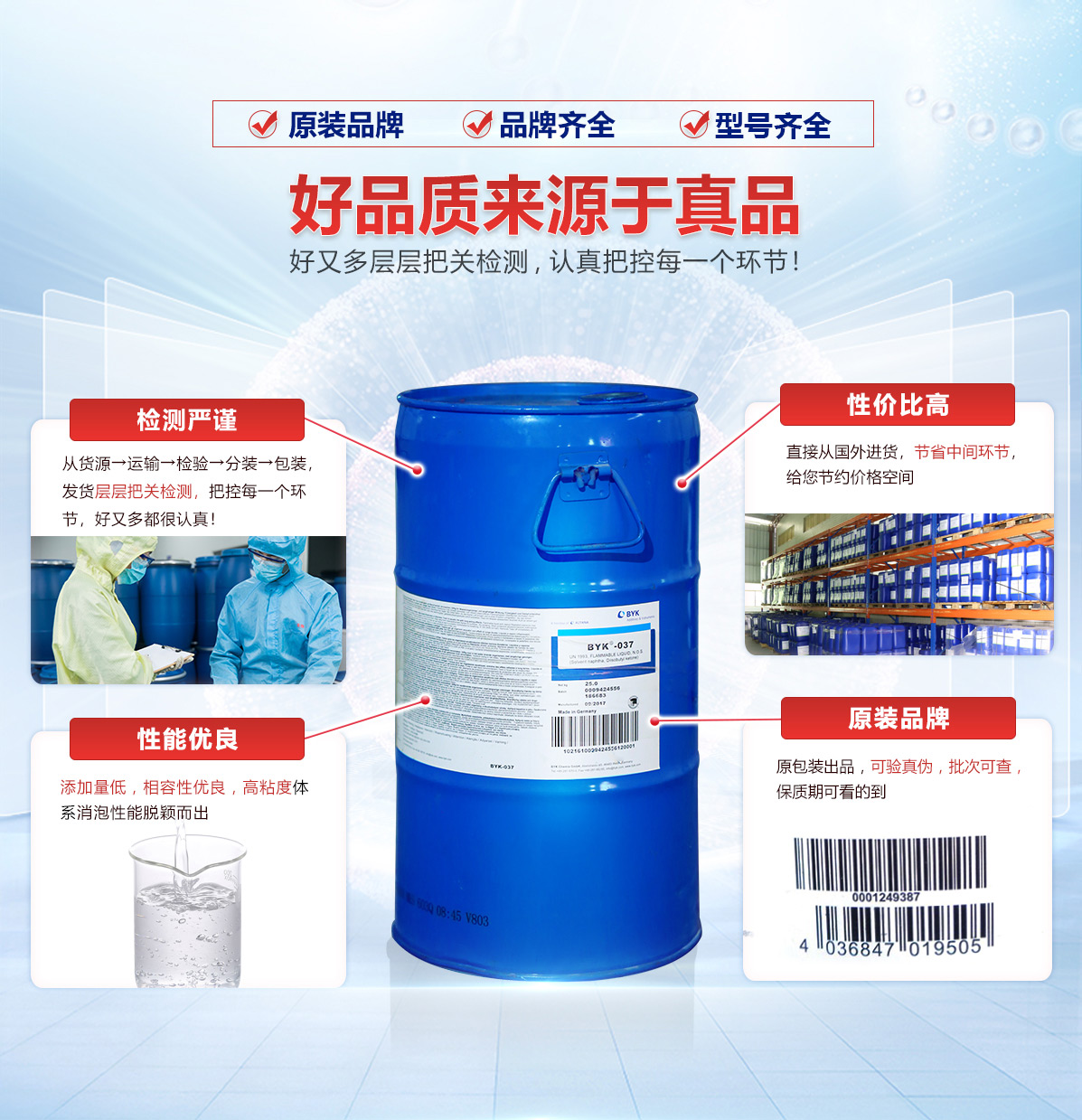 | 乳膠漆消泡劑 | 具有自乳化、易分散、通用性強、消泡好 | 德國 | 20KG桶裝 | 12個月 |